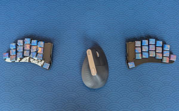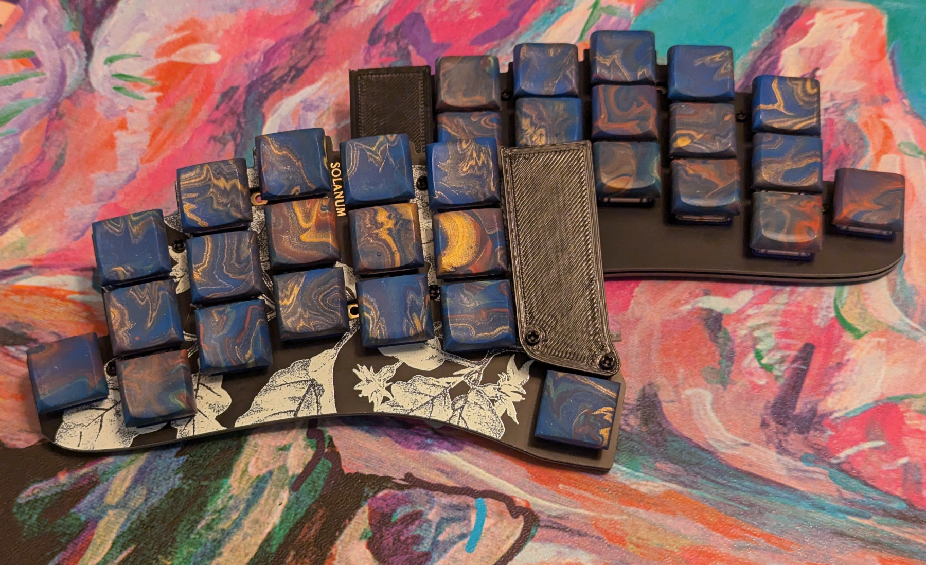 A 34-key split featuring splayed columns, a single thumb, and a extra pinky key.